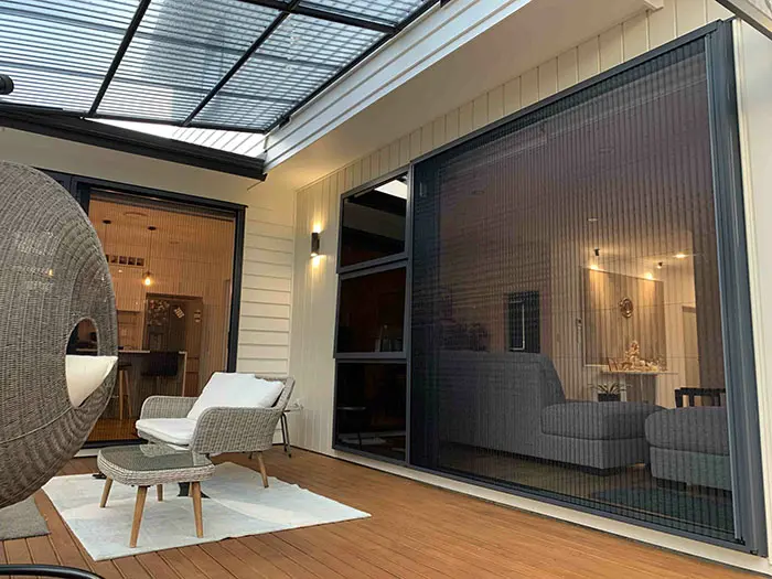Vẫn giống như rèm kéo 1 bên, kiểu cửa lưới này có tác dụng như một cánh cửa nhưng phạm vi sử dụng khi này là rộng hơn.
