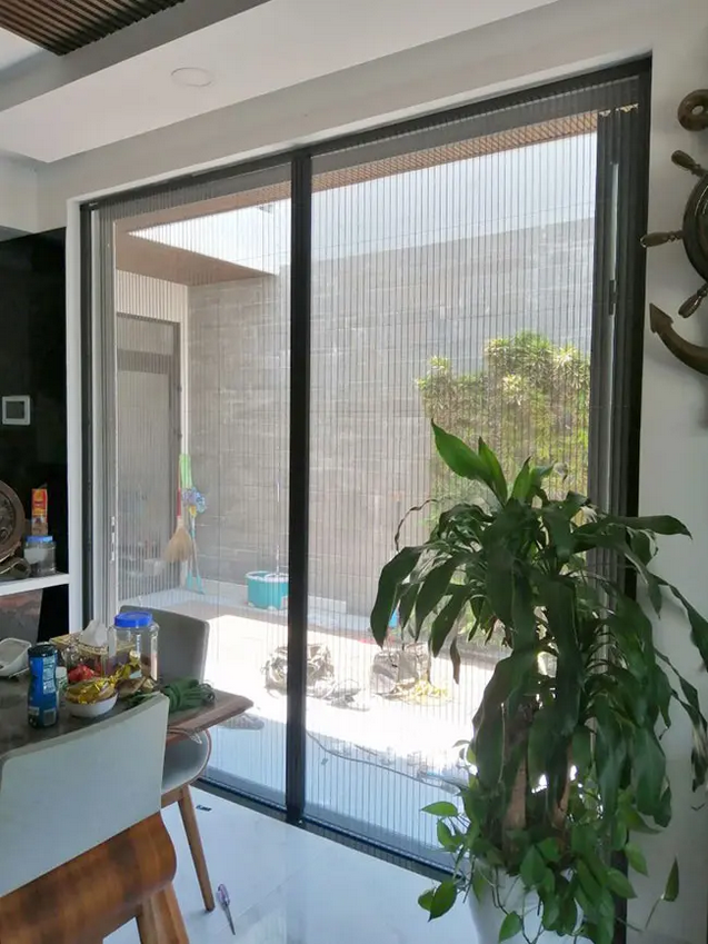 Vẫn giống như rèm kéo 1 bên, kiểu cửa lưới này có tác dụng như một cánh cửa nhưng phạm vi sử dụng khi này là rộng hơn.