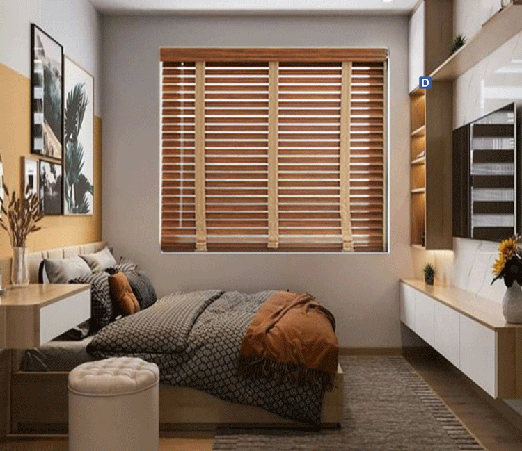 Màn cửa gỗ là một mẫu rèm cản nắng rất tốt. Với các ô cửa sổ nhỏ của phòng ngủ thì đây là một lựa chọn phù hợp. Rèm vừa giúp phòng ngủ trở nên mát mẻ hơn, vừa gọn gàng tiết kiệm diện tích.
