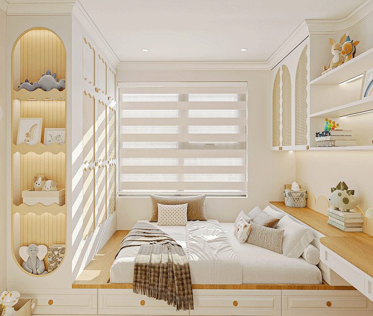Rèm cầu vồng có thiết kế đơn giản gồm 2 lớp vải xen kẽ nhau: vải kín chống nắng và vải lưới. Khi sử dụng, 2 lớp vải này sẽ tạo ra những khoảng sáng tối đan xen giúp điều tiết lượng ánh sáng vào phòng một cách linh hoạt.